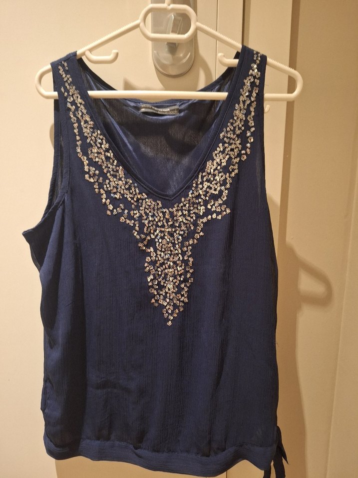 Payet işlemeli, V yakalı, kolsuz lacivert bluz. Bohem tarzda, rahat kesim ve midi boyda, yumuşak tekstil kumaştan yapılmıştır.
