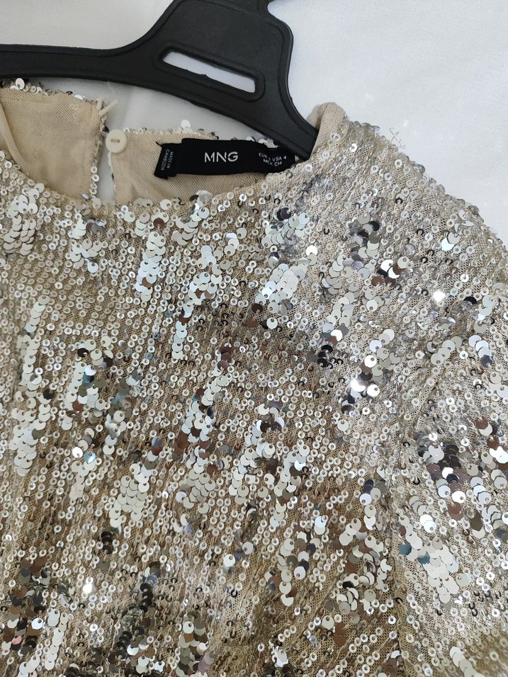 Bej renkli, payet işlemeli midi elbise, yuvarlak yaka ve uzun kollu, bol kesim ile göz alıcı parti tarzı sunar. Marka: MNG. ✨
