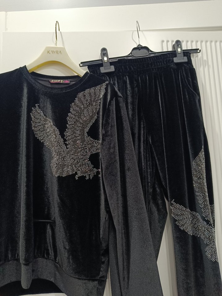 Siyah sentetik kumaştan, uzun kollu, bisiklet yaka, payet işlemeli kartal desenli, bol kesim kadın eşofman takımı. Günlük kullanım için rahat ve şık.
