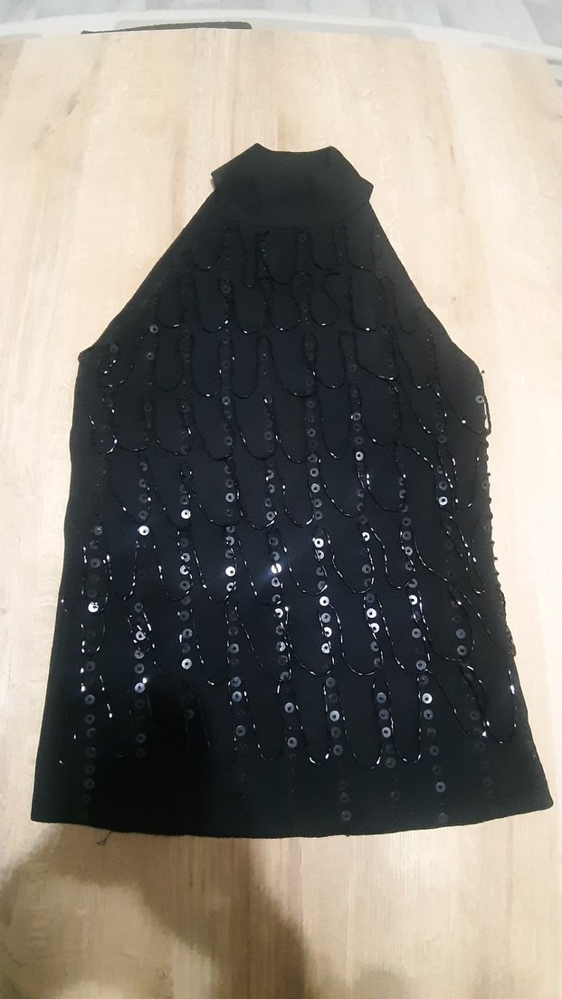 Dar kesim, siyah kolsuz bluz yüksek yakalı ve payet işlemelidir, partiler için şık ve göz alıcıdır.Yalnız bir kere iki saatliğine giyildi.Cok güzel ve çok iyi durumda ✨ MARKA TEMSİLİDİR