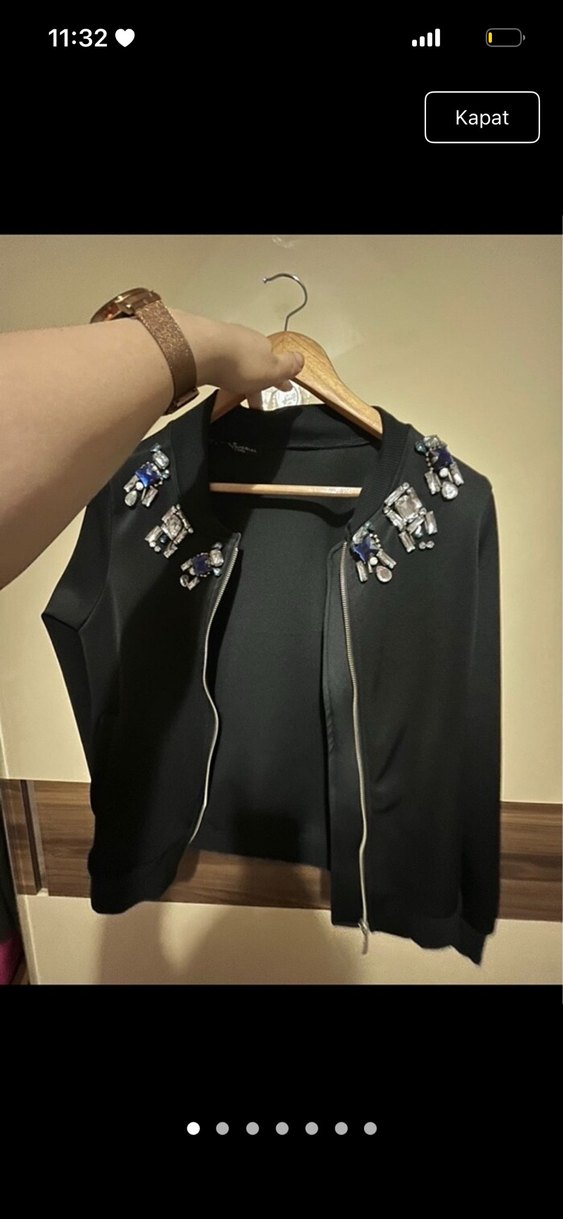 Fitted kesim siyah midi ceket, yakasında payet işlemeleri ve uzun kollu. Syntetik kumaştan, trend sokak stili için uygun.