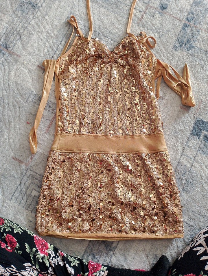 Bej renkli, straplez ve kolsuz mini elbise. Parlak payetler ve işlemelerle süslenmiş, vücuda oturan kesimiyle parti için ideal.
