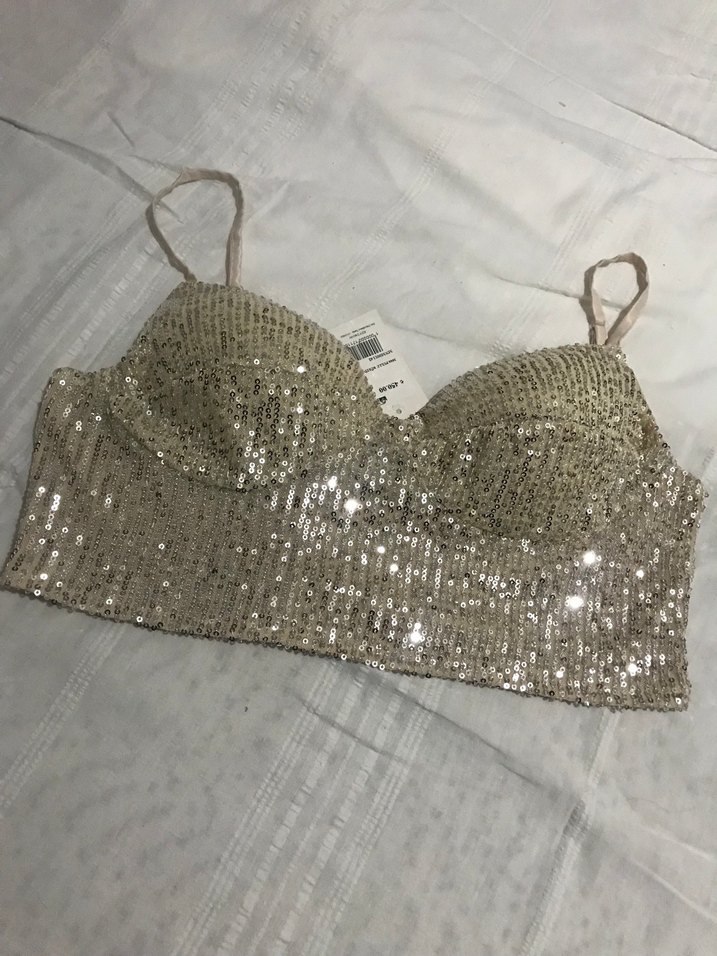 Parlak bej payetlerle işlenmiş, ince askılı ve straplez yakalı, oturan kesim bustiyer. Parti için uygun. ✨Marka temsili
