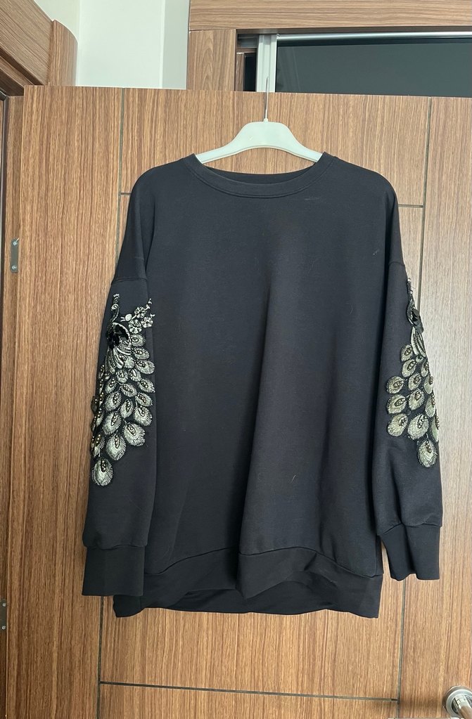 , uzun kollu ve yuvarlak yakalı bu sweatshirt bol kesimdir. Kollarında payet işlemeli tavus kuşu tüyü desenleri vardır, sentetik kumaştan üretilmiştir, günlük kullanıma uygundur.