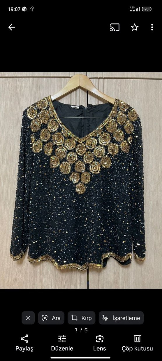 Bol kesim uzun kollu vintage kadın bluz, altın payet işlemeli ve yuvarlak yakalıdır. Koyu renkli triko kumaş ve detaylı desenlere sahiptir. ✨