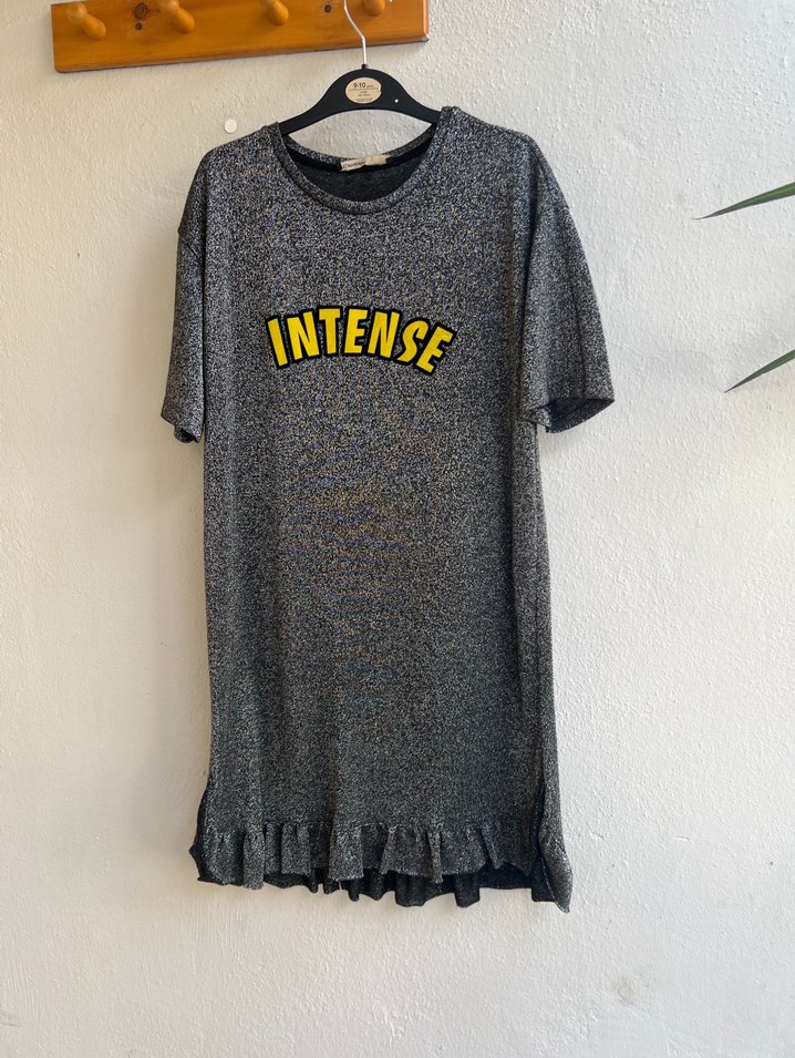 Payet kumaş defosuz elbise, kısa kollu ve yuvarlak yakalıdır. 'INTENSE' baskılı, bol kesim ve etek kısmında fırfır detayları bulunur.