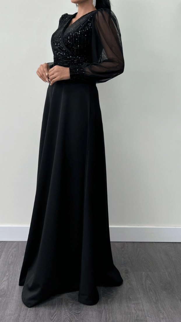 Payet kumaş, tül kollu şık elbise - siyah