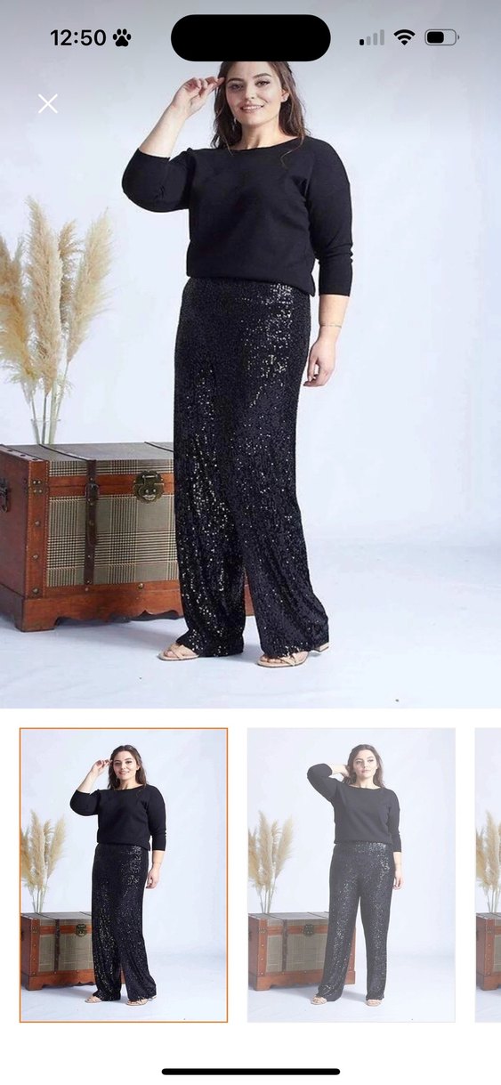 50 beden çok şık bir pantolon.sadece kargo geldiğinde evde denedim onun dışında hiç giymedim.etiketi üstünde.1900tl ye aldım.payetler bacağa batmıyor içinde astarı var çok kaliteli.
