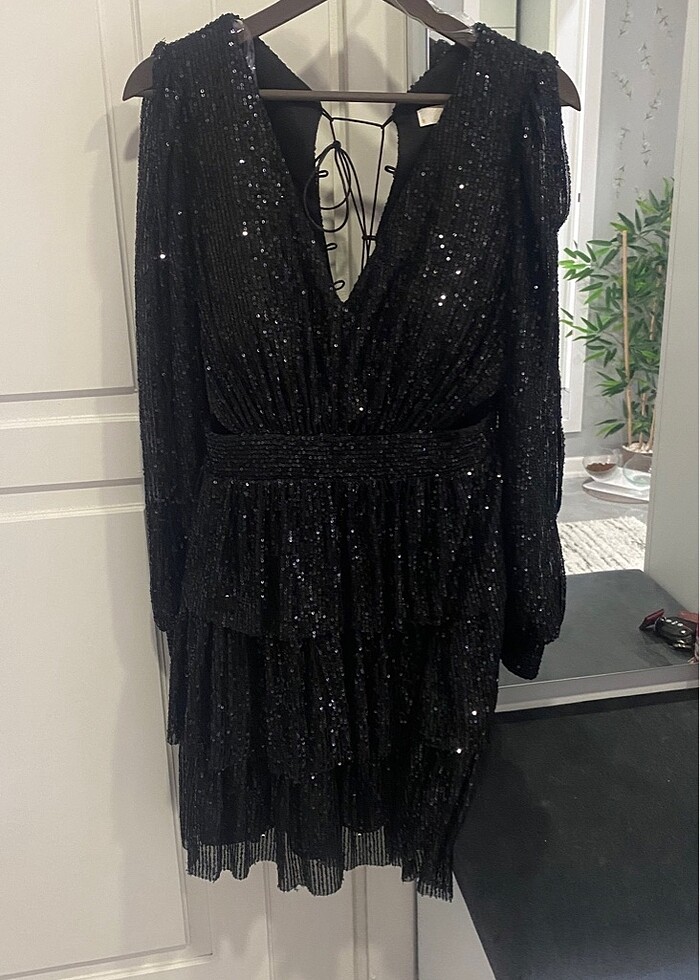 arkası ipli, göbeği ve basenleri çok güzel kamufle ediyor. ışıl ışıl bi elbise 1 kere kullandım hiçbir deformesi yok.oldugundan çok zayıf gösteren bir elbise 38-42 beden arası olur.