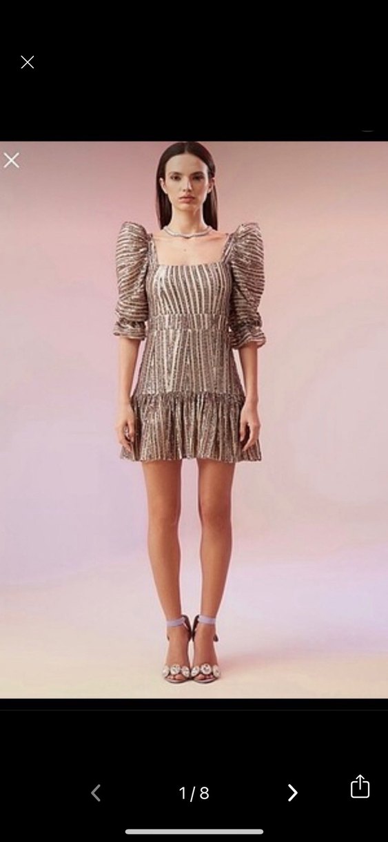 Payetli desenli, bej renkli mini elbise. Strappy kollu, fitted kesim ve tekne yaka ile dikkat çeker. Parlak sentetik kumaştan üretilmiştir. 1 kere giyildi artık bir daha giymeyeceğim için satıyorum✨