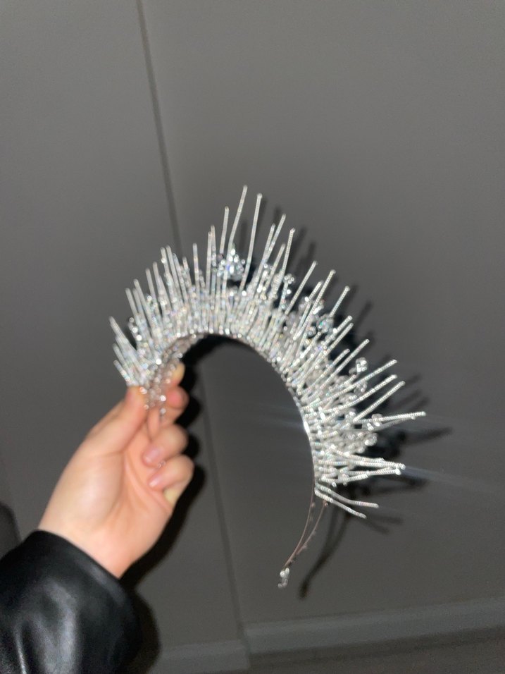 Beyaz ve gri payetlerle süslenmiş, sivri uçlu avant-garde gelin tacı, modayı takip edenler için tasarlandı. ✨
