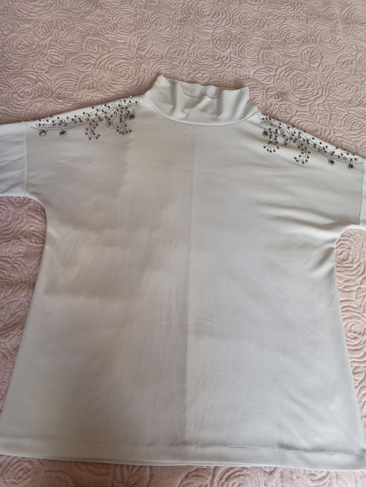 Beyaz kadın bluz, yüksek yakalı ve uzun kollu, bol kesimli. Omuzlarda payet süslemeli, yumuşak sentetik kumaştan, günlük sokak stili için uygun.