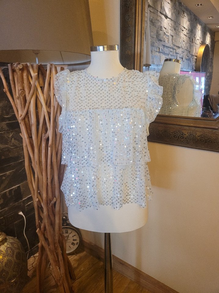 Payet işlemeli, kısa boylu, kolsuz beyaz triko bluz. Bol kesim ve yuvarlak yakalı, bohem parti stiline uygun.
