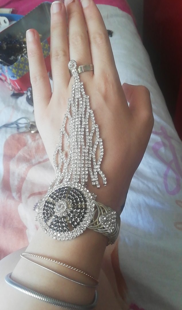 Gri renkli, payetli ve yılan derisi desenli bu el zinciri, bohem ve retro tarzları birleştirerek göz alıcı bir görünüm sunar.