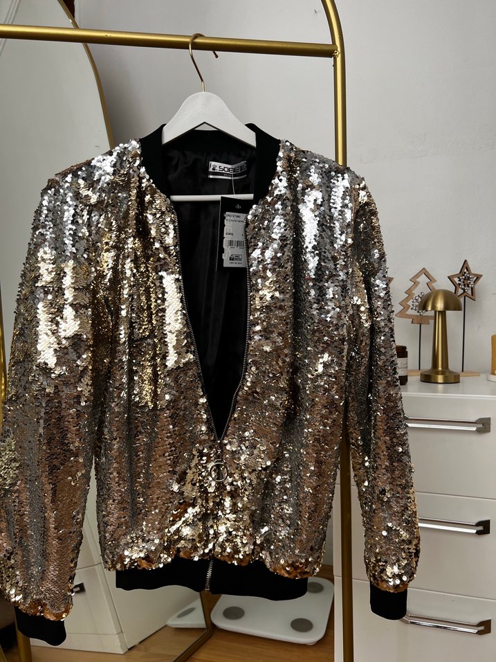 Altın renkli, payetlerle kaplı, bol kesim ve uzun kollu midi ceket. Notlu yaka ve metalimsi dokusu ile parti için uygun. ✨