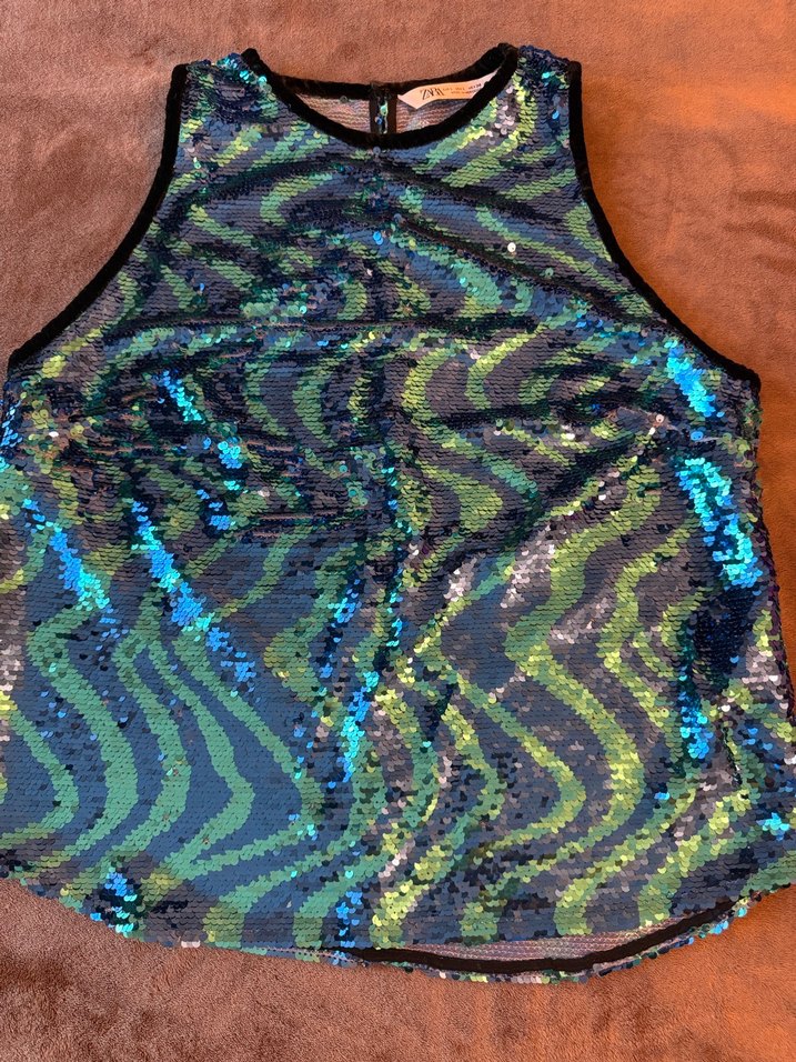 Kolsuz, straplez yakalı, vücuda oturan kadın bluz. Mavi yeşik payetli detaylara parti için uygun. ✨
