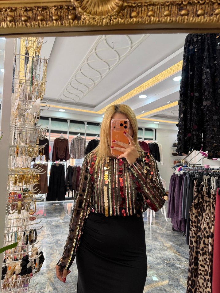 Dar kesim, uzun kollu, yüksek yakalı, koyu çok renkli tie-dye desenli ve payetli uzun gece bluz, parti için uygundur. ✨S,M,L bedenleri mevcuttur.