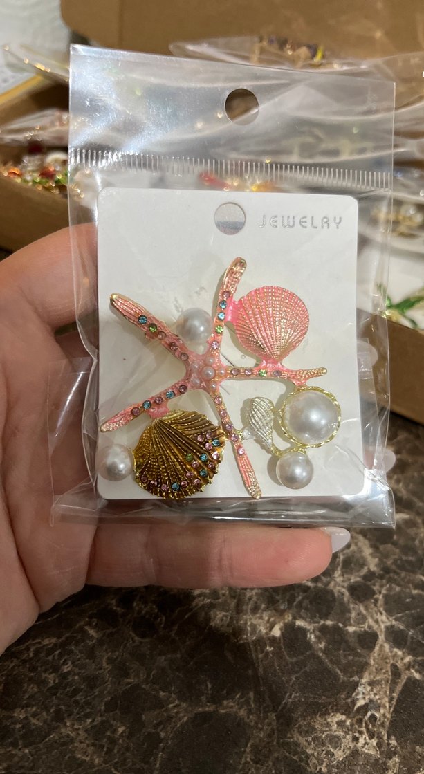 Payetli, açık renkli çok renkli deniz kabuğu ve denizyıldızı figürlü bohem tarz broş, inci detaylı, günlük kullanım için uygundur.