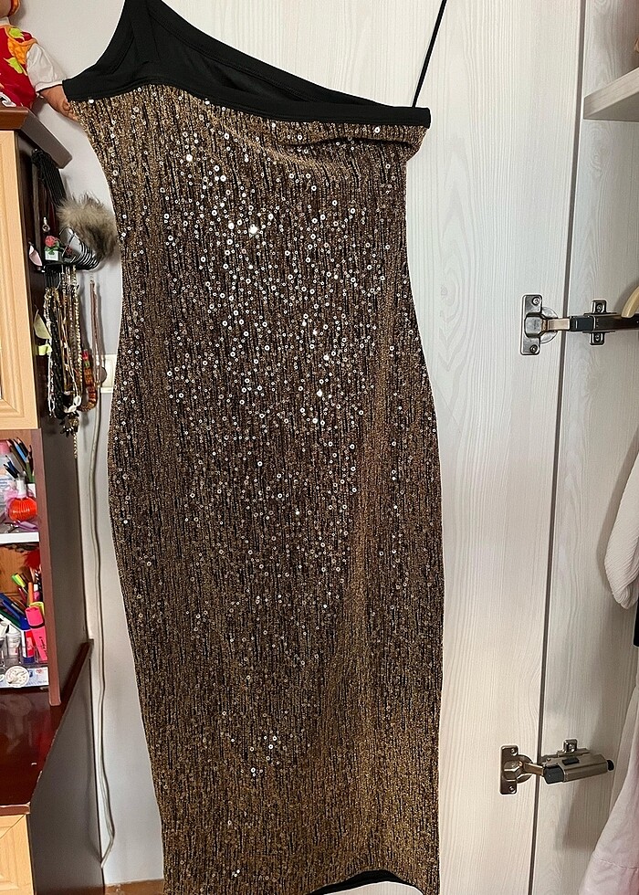 Tek omuz vücutu saran payet elbise. Hiç kullanılmadı etiketini koparıldı yeni