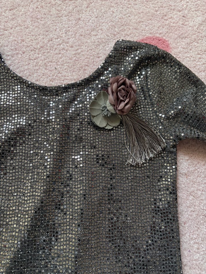 Nakışlı çiçek detaylı, payetli gri broş. Püskül aksanlı, parti ve avangart tarzlara uygun. ✨