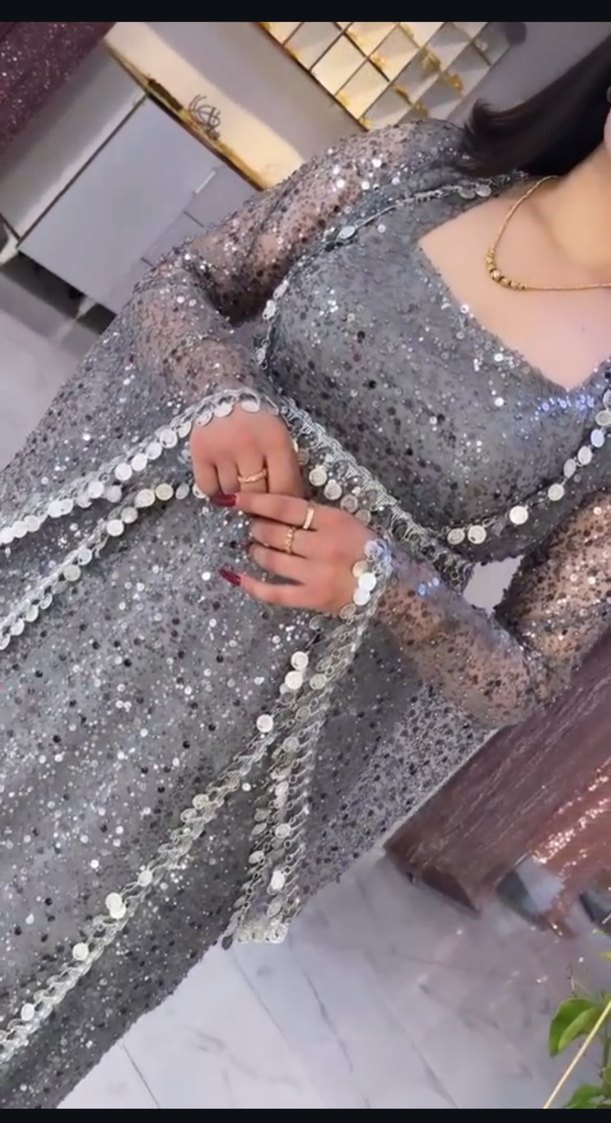 sıfırdır ölçülere göre dikilir her rengi mevcuttur Bu payet işlemeli, uzun kollu, tekne yaka ve vücuda oturan gri abiye elbise, düğünler için çağdaş ve göz alıcı bir seçenektir. ✨