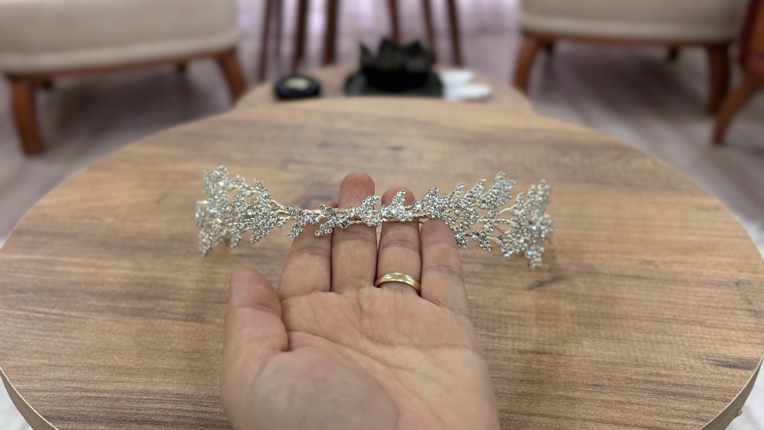 Bej ve gri renklerde, payetli ve nakışlı kadın el zinciri. Düğünler için uygun, bohem ve klasik şıklığı yansıtan detaylı desenlere sahip. ✨