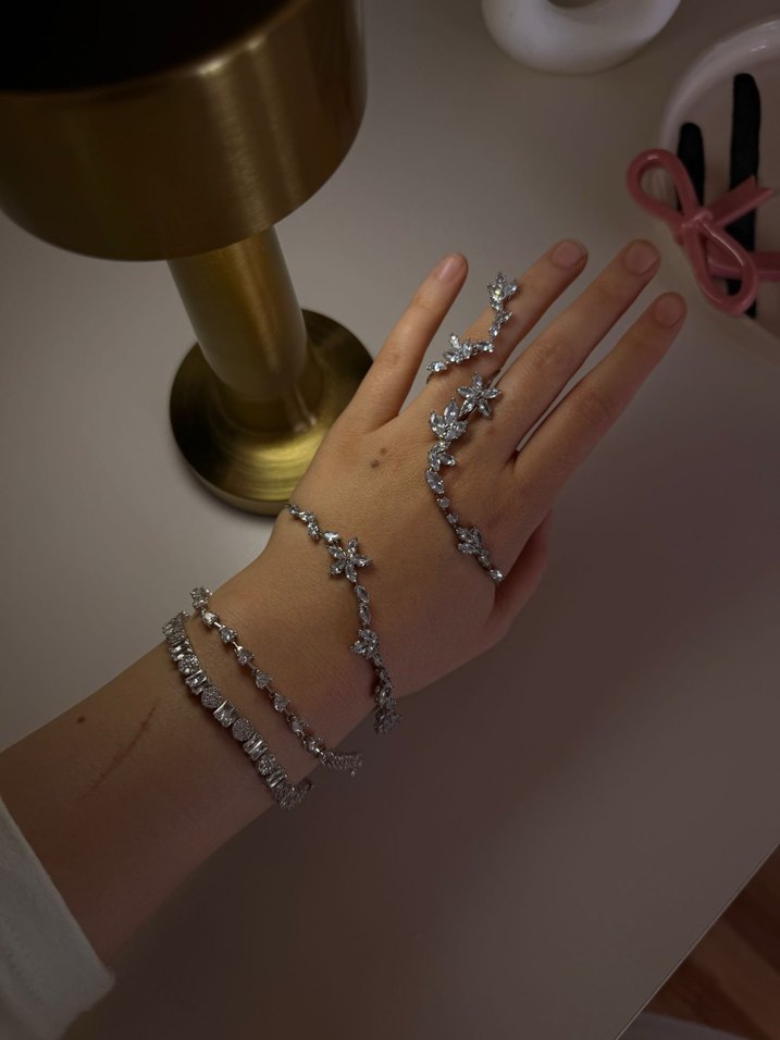 Payetli detaylara ve gümüş çiçek desenine sahip kadın el zinciri, gösterişli düğünler için uygundur. Moda öncülerine hitap eden avangart bir tarz sunar. ✨