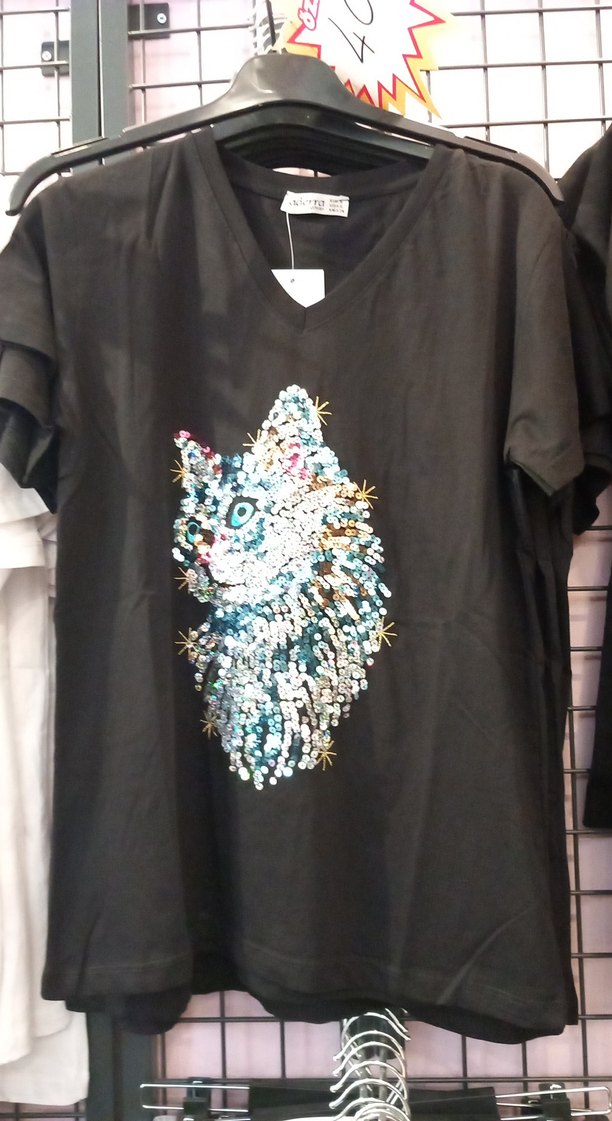 siyah sokak stili tişört, payetlerle süslenmiş renkli kedi baskısına sahip.