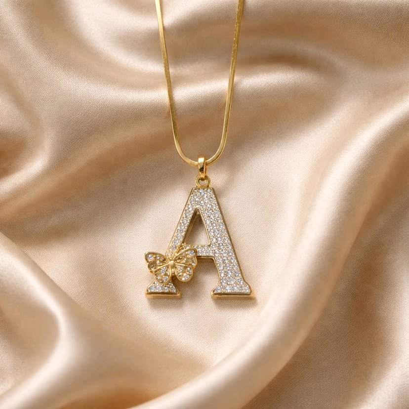 Payetli 'A-B-C-D-E-F-G-K-M-N-S-T-Y-Z' harfleri ve nakışlı kelebek detaylı, altın renkli midi uzunlukta kolye, cesur ve gösterişli tarzlar için uygun. ✨