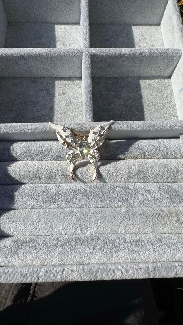Payetlerle süslenmiş kelebek tasarımlı broş avant-garde ve bohem tarzını yansıtır. Düğünler için uygun, işlemeli desene ve gri tona sahiptir.