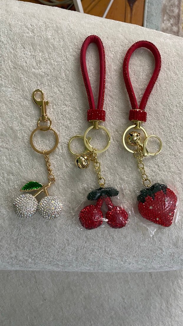 Payetli meyve tasarımlı kırmızı, renkli kadın anahtarlıkları. Altın renk detaylar ve bilek askısı ile bohem tarzda. Adet fiyatıdır . Şıklığınıza detay katın .