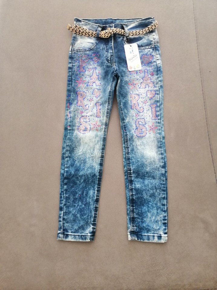 Renkli batik desenli, payet detaylı, kemerli ve kız kot pantolon, sokak modasına uygun.6 yaş