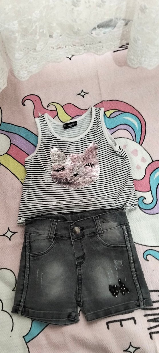 Çizgili kolsuz üstü payetli kedi figürü süsler, gri denim şort ise hafif yıpratılmış detaylara sahiptir.