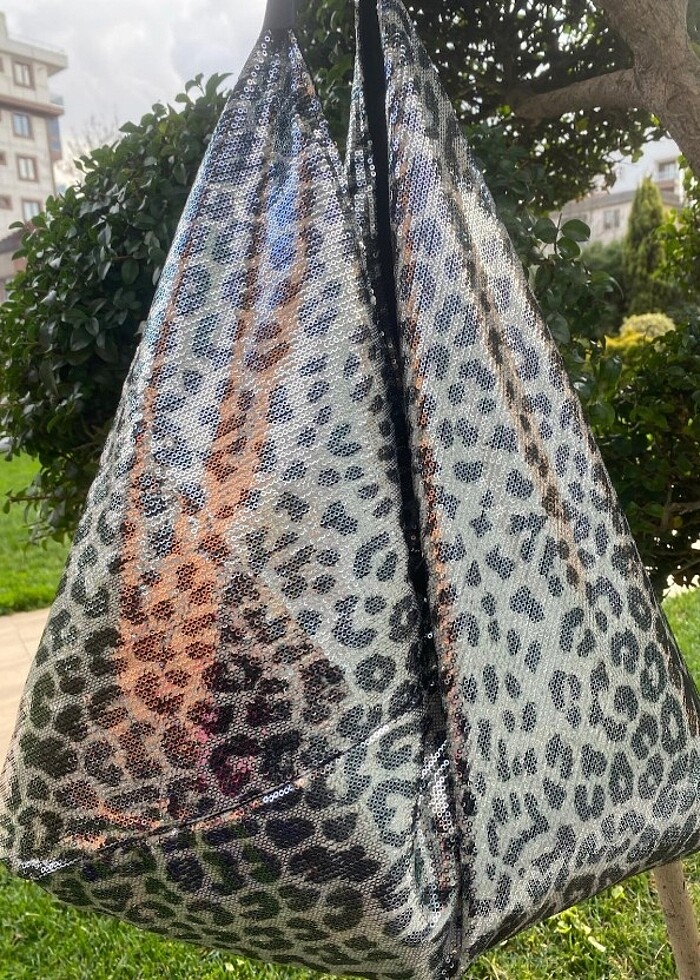 Tasarım çanta payet şıklığı leopar desen origami canta