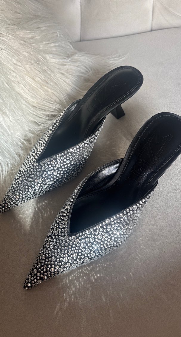 Payetlerle kaplı sivri burun stiletto terlikler, hiç giymedim ihtiyaç fazlası. günlük kullanıma şık ve çağdaş bir dokunuş katıyor. Koyu yılan derisi deseni ve kauçuk malzeme ile tasarlandı. ✨