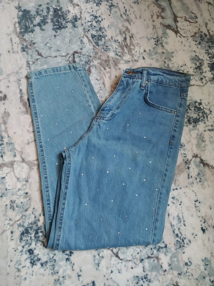 Payetli detaylara sahip mavi denim kot pantolon.Midi boyda ve beyaz pullu.Cok rahattır..Boyu 98 cm