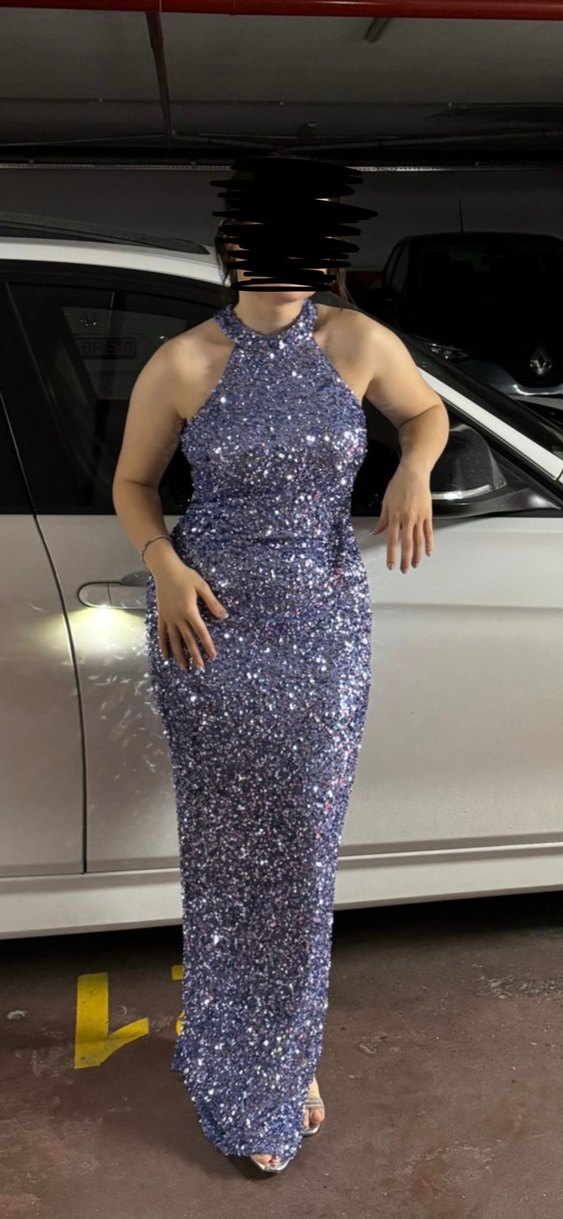 Boy:145cm 1 kez giyildi. Paketinde muhafaza ediliyor. Mora kaçan mavi renginde, yüksek yuvarlak yakalı ve kolsuz, kendinden göğüs pedli,vücuda oturan uzun abiye elbise. Parlak pullarla kaplanmış, gösterişli ve cesur bir parti kıyafeti. ✨