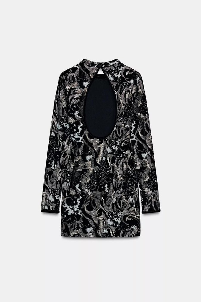 Siyah renkli, gümüş payet desenli ve uzun kollu, yüksek yakalı, mini elbise. Sıkı kesimi ve açık sırt tasarımıyla modern bir görünüm sunar.