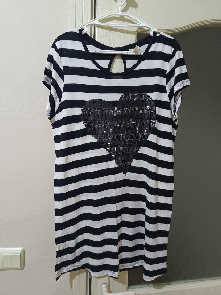 Kısa kollu, yuvarlak yakalı, siyah beyaz çizgili ve payetli kalp desenli, bol kesim Günlük sokak stiline uygundur. ❤️