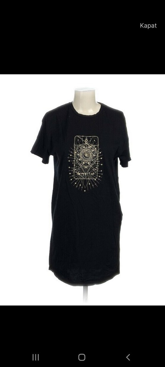 Siyah, bol kesim kadın elbise, kısa kollu ve yuvarlak yakalıdır. Payet detaylı baskılı tasarımı, ipeksi kumaşla romantik akşamlar için uygundur.