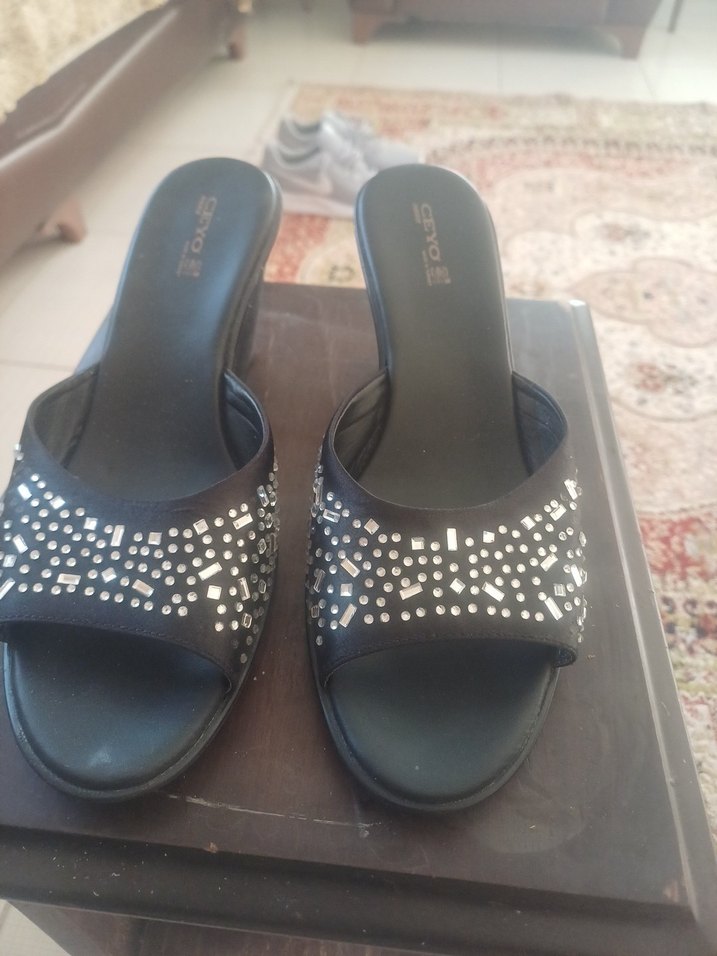 Siyah dolgu topuklu, taşli terlik, romantik akşamlar için uygundur.