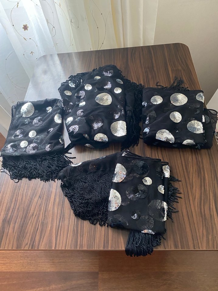 Siyah payetli dairesel desenler ve püsküllü kenarlarla gotik ve avangart tarz için uygundur. ✨iki küçük sehpa örtüsü