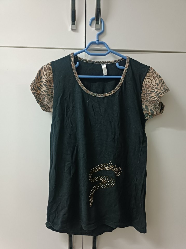 Kısa yılan desenli kollara ve ön yüzde payet detaylara sahip siyah hamile tişörtü. Yuvarlak yaka ve bol kesim rahat kullanım sağlar. Günlük rahat stil için uygun.