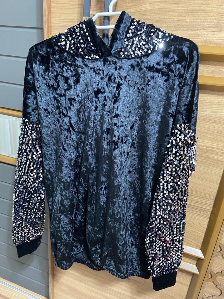 Siyah, uzun kollu, bol kesim ve bisiklet yaka sweatshirt. Kolları ve kapüşonu payetli, desenli ve yumuşak sentetik kumaştan yapılmıştır. Gotik tarz ve parti için uygun.