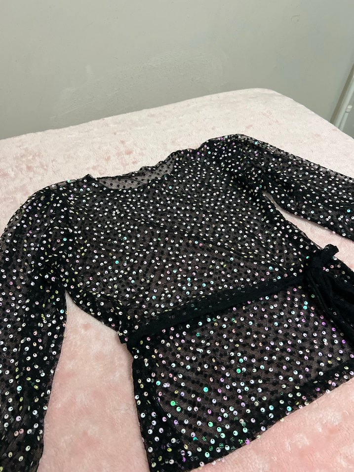 Uzun kollu, yuvarlak yakalı, bol kesim kadın bluz, siyah kumaş üzerine payetli ve puantiyeli, parti için uygun.