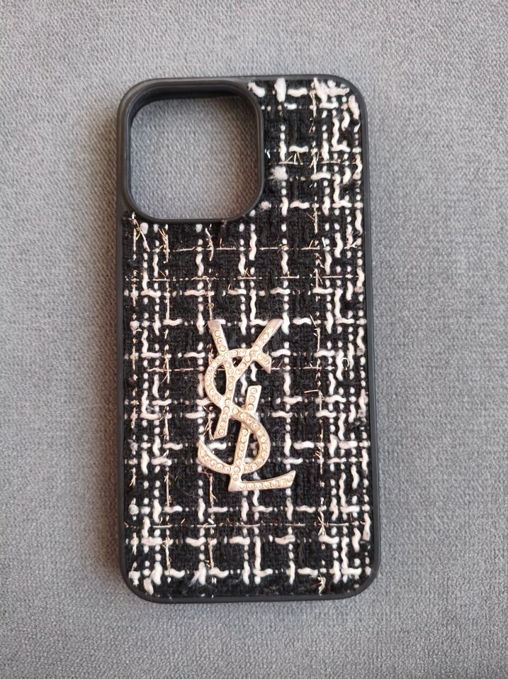 Payetli ve dokulu desene sahip siyah street wear telefon kılıfı, ortasında şık bir logo bulunur. İPhone 15 pro Max