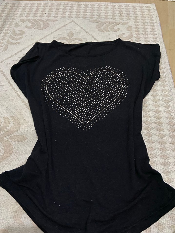 Kısa kollu, yuvarlak yakalı siyah tişört, payetli kalp desenlidir. Rahat kesim ve normal midi boydadır, yumuşak sentetik kumaştan yapılmıştır.