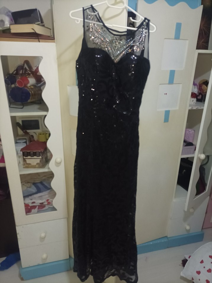 V yaka, kolsuz, payet işlemeli desenli, siyah uzun abiye elbise, şık ve gösterişli bir görünüme sahiptir. ✨