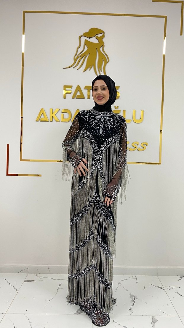 Siyah uzun abiye elbise, yüksek yakalı ve uzun kollu, etnik desenli ve payet işlemeli, mütevazı kesimli ve düzenli oturuşlu, şık parti elbisesi. ✨