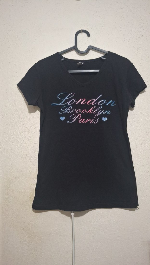Siyah, pamuklu, V yakalı ve kısa kollu kadın tişörtü. Payetli Londra, Brooklyn ve Paris baskısı ile rahat ve salaş kesim. Günlük kullanıma uygun.